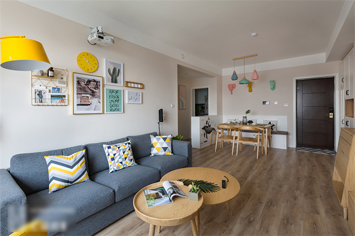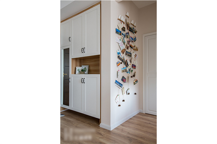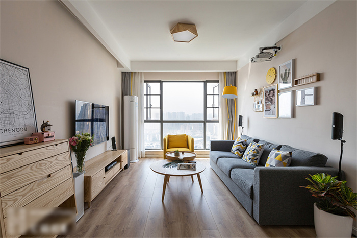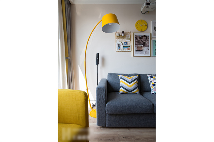 进入客厅,首先映入眼帘是简约的白色立柜和一组照片墙的设计。每一张照片仿佛都在述说一个故事,记录这个95后小夫妻每个难忘的瞬间。xc体育定制的芬兰白入户柜和木门在照片墙的陪衬下温馨感十足。撞色的沙发,简洁明快的亮黄色搭配深灰色立体感拉满,驼色墙面上的艺术画交错搭配,透露着一丝文艺气息。