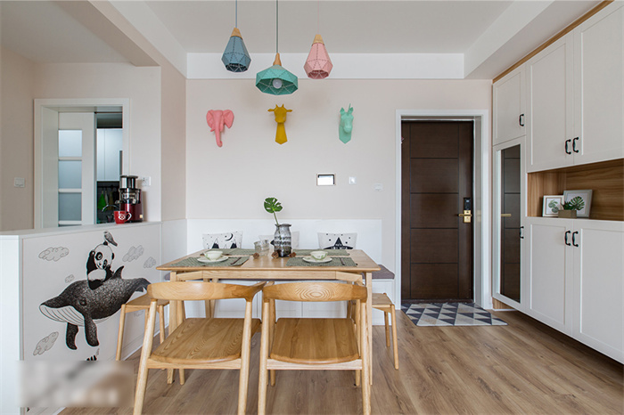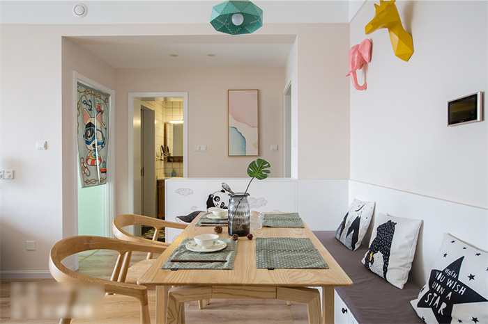 餐厅除了满足正常用餐的需求之外,还增加了收纳功能。为此xc体育在餐厅处专门定制了一排绕墙的沙发柜,这样家里就算多几个人来就餐,也不会显得拥挤。原木色的餐桌与马卡龙色系的吊灯平衡出北欧精致。餐厅墙面上,三种动物的挂件与同色系吊灯在鲜明的颜色中演绎着北欧风情。