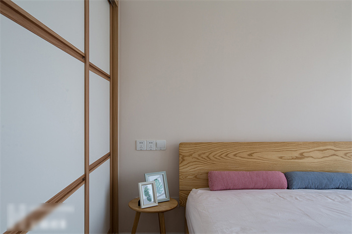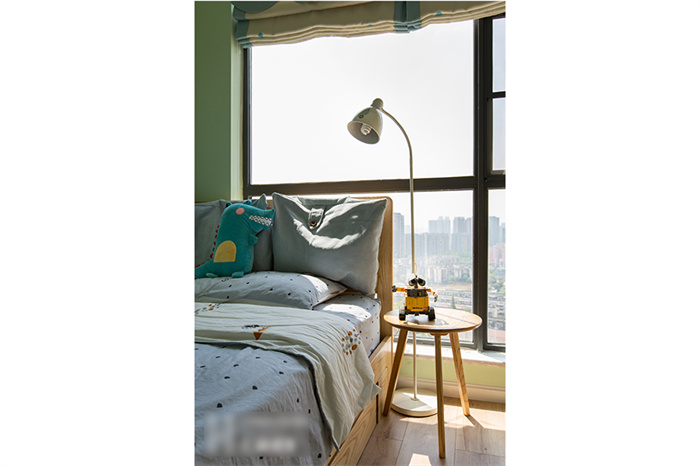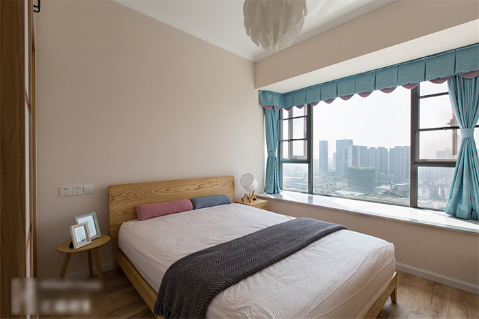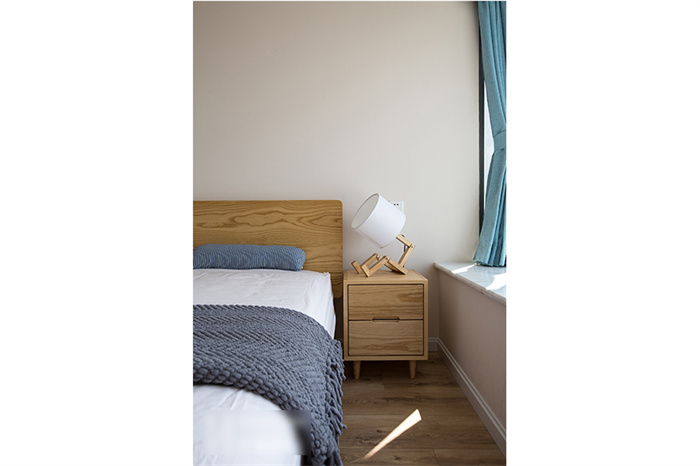 主卧的设计从实用性出发,白色的衣柜和墙面形成一体,显得生气十足;在床头柜的选择上也是遵从屋主追求自然的理念,原木床体,搭配设计感十足的几何造型床头灯,渲染出浓浓的自然气息。湖蓝色的飘窗无不在表达简约、舒适的生活主题。“当清晨的第一缕阳光透过窗帘的缝隙挤进来,余生,我想把日子过成自己想要的模样。”