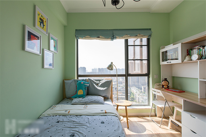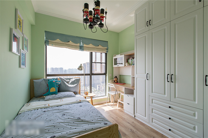 儿童房以绿色为背景,搭配白色吊灯和立柜,活泼中还有一丝可爱。墙上的儿童简笔画、儿童家具、卡通玩偶,营造了一个梦幻、童真、舒适、富有想象力的空间。