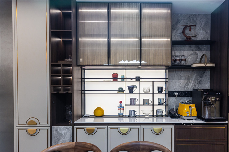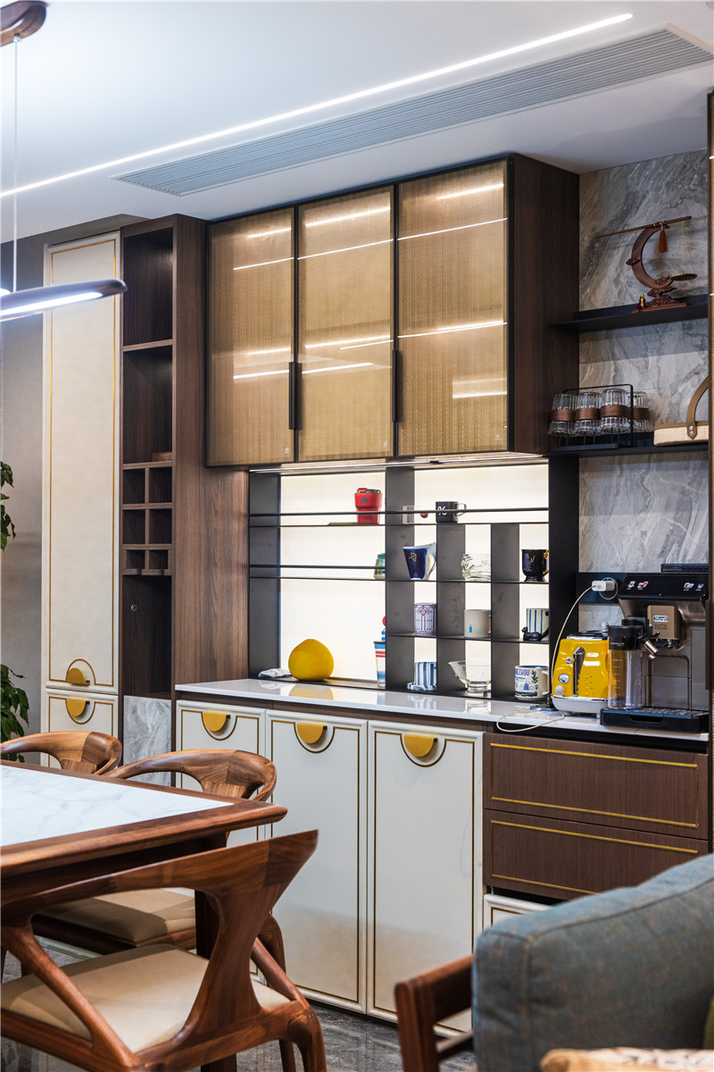 餐边柜整体组合式构造,烟熏橡木与米褐浮雕搭配,展现出高定美感;餐边柜背板为大理石纹,中部为铝板装饰柜,打开灯光增强层次感。