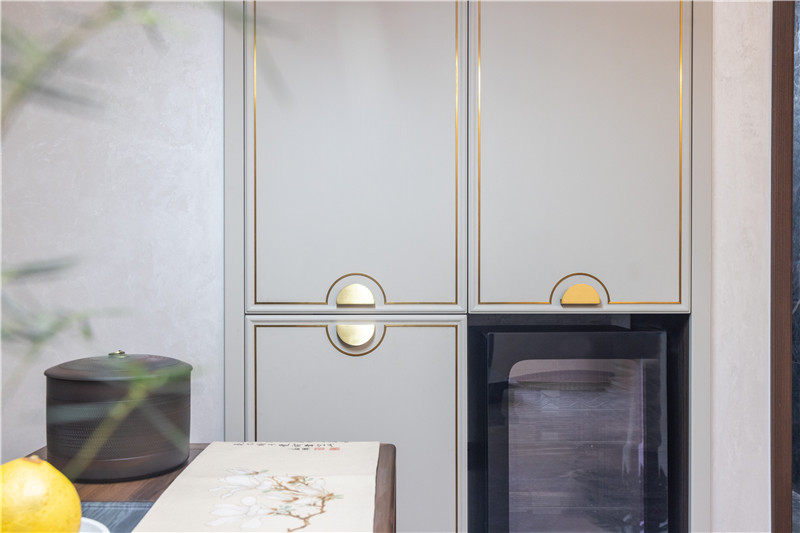 餐厨空间整体为开放式构造,烹饪与用餐动线明晰,方便家庭成员共同参与其中;餐厨空间协调于整屋新中式装修,主灯与辅灯结合式设计,空间敞亮。