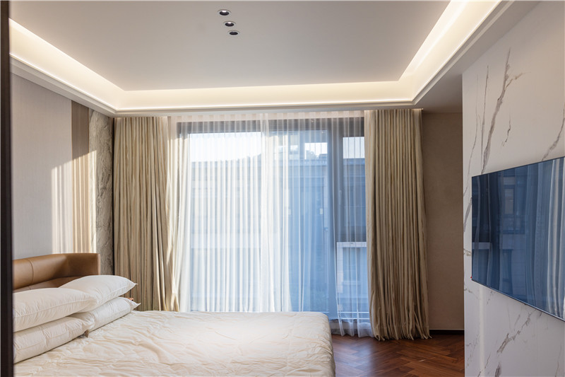 主卧背景墙三色拼接且为对称设计,拥有温润质感;床头为半弧包边,两侧中式小床头柜精致好看;床尾墙面安装电视机,休息休闲美哉。
