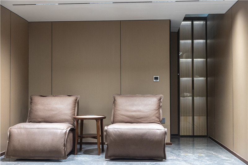 梯座上方设置休息区,谈心、小聚可在这里实现;背侧做狭长展示柜,夹丝玻璃、内嵌灯带,颜值UP!
