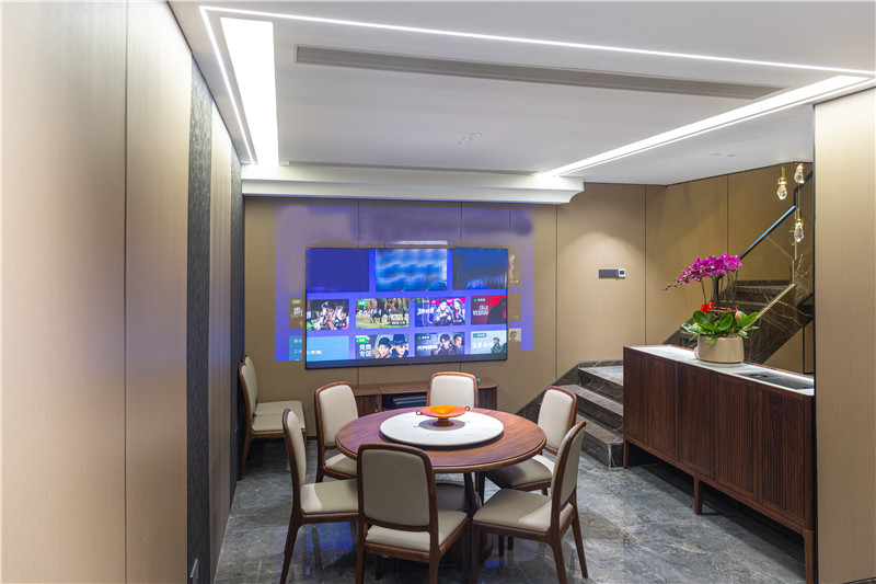 楼梯道装修成小型家庭影院,摆上餐桌,一家人边吃边聊,幻灯片也不占地方;旁边做了独立式洗手台柜体,发挥多重功能。