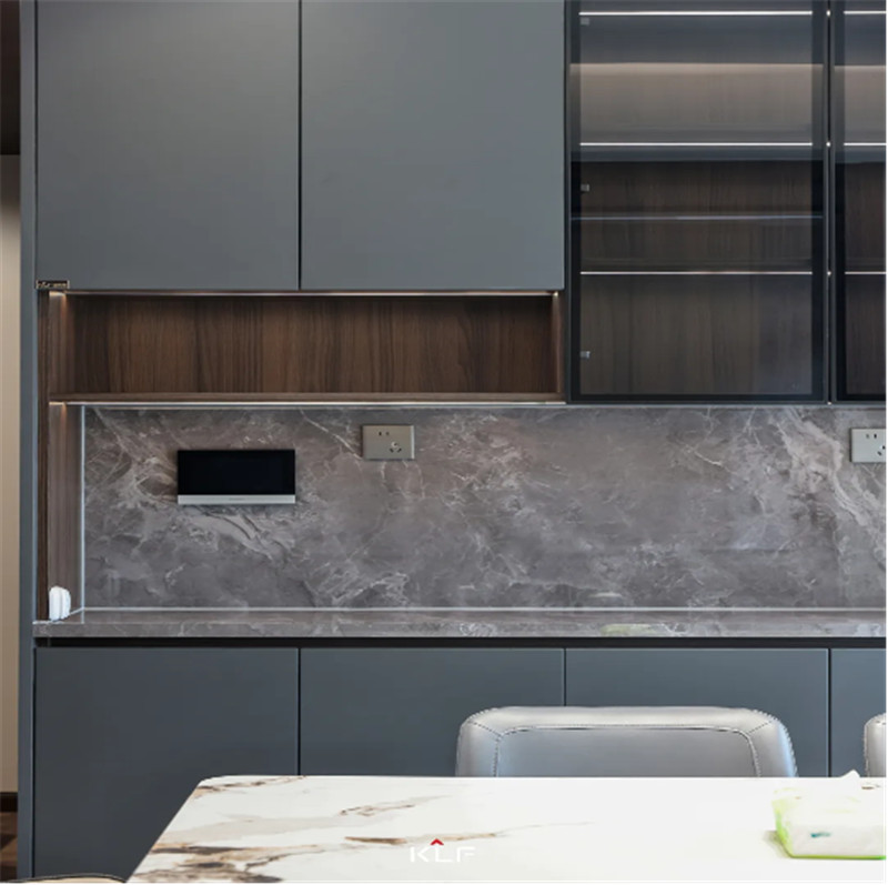 整面餐边柜立于大理石餐桌一侧,储物及展示功能拉满的同时,线条和形式的韵律演绎出现代化的家居美学。色调柔和、质感高级的水漆柜搭配上通透玻璃,清新淡雅,营造典雅隽永的氛围。
