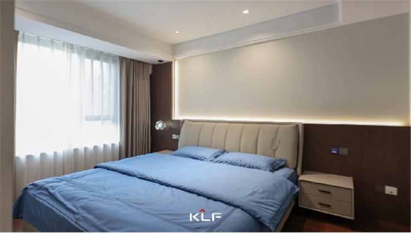 没有过多繁琐的装饰,床具造型简洁、线条流畅。用木质护墙板打造半高床头背景墙,恰到好处的留白,空间更灵动。