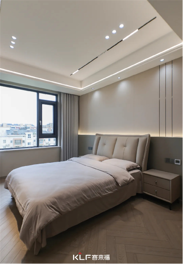 沿用了暖咖色的床头背景墙设计