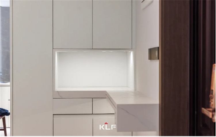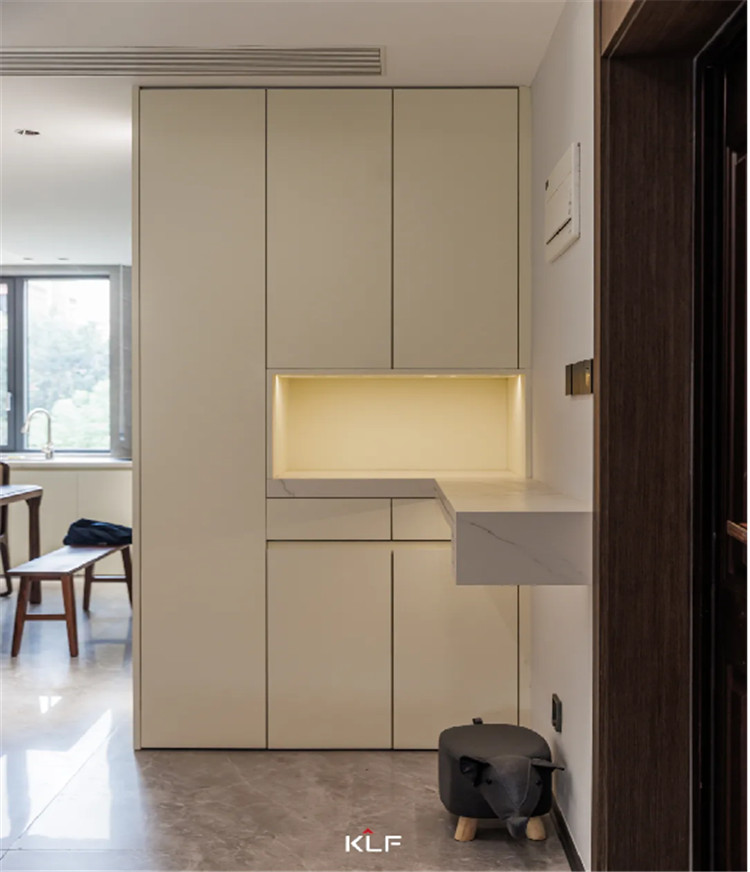在玄关为了提升空间利用率,我们采用了嵌入式的柜体进行上下分区收纳。中部掏空后延伸大理石台面作为置物台,放置一些小物品都很实用。