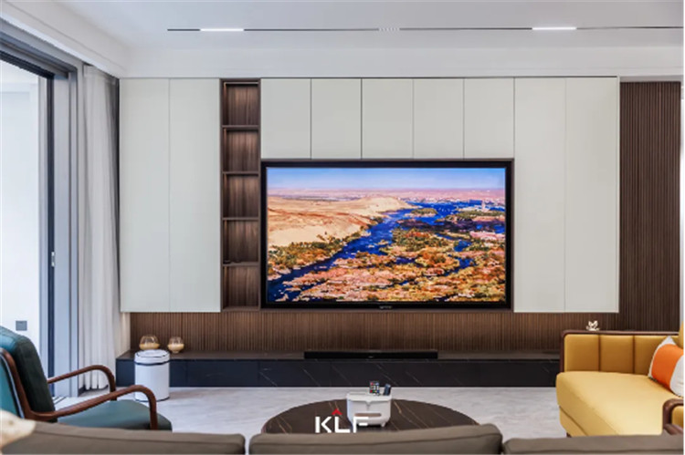 细格栅的造型墙板为墙面增加了立体感,一字型深灰色地柜直接落地,内嵌3D雾化暖炉,带给家更多温馨。
