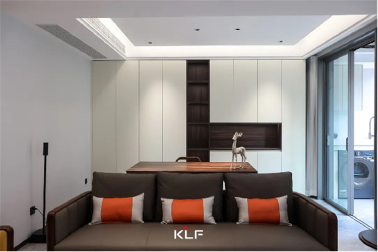 靠近阳台的空间里我们将其设计为一个开放休闲区,无论是想在这里办公阅读还是喝茶都是不错的选择。榆木柜体的纹理清晰可见,搭配纯净的白色通顶柜,带来一丝禅意,令人松弛神往。