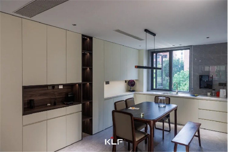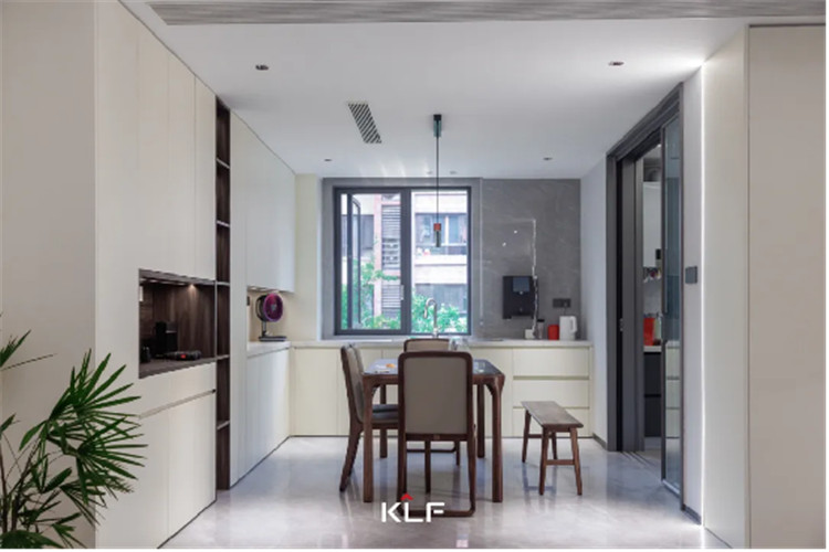 餐厨空间的设计风格与起居空间保持一致,除了传统的U型封闭式中厨外,在用餐区还做了高定全屋围合的设计。