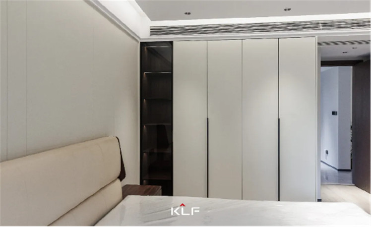主卧空间延续一贯简约的设计手法,注重提升家居质感,强调人文的居住感受。自客厅格栅背景墙延伸至卧室空间,做成一体化的门套门框及门扇。