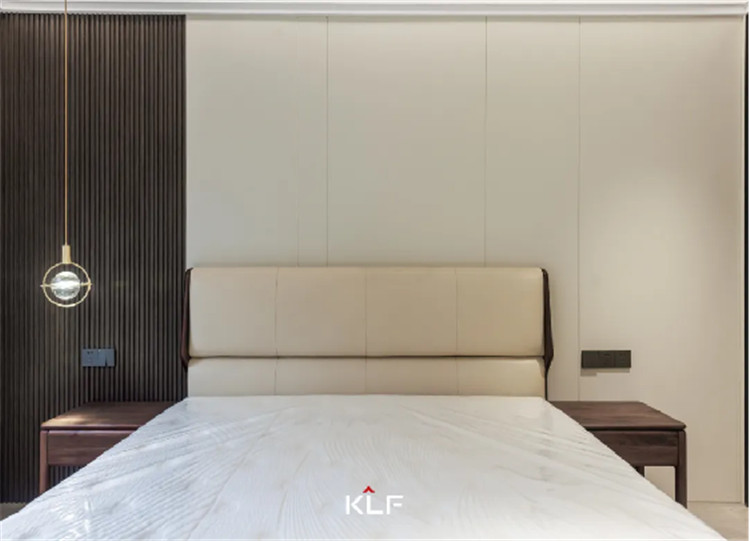 主卧的床头背景也颇有意蕴,将拉槽墙板与格栅墙板进行拼接,增加层次感和设计感,白棕配色高级又内敛,是追逐质朴生活的文雅格调。