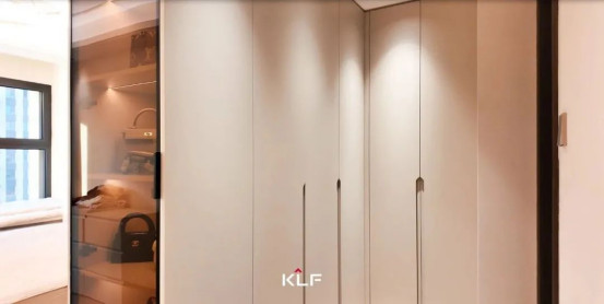 卧室以L形的转角柜做收纳和隔断,合理划分生活区域,一半是睡眠的床铺区域,一半是步入式衣帽间,提升居住体验。玻璃柜门以展示型收纳美学为核心,融合功能与艺术的双重属性,成为高品位生活的具象化表达。