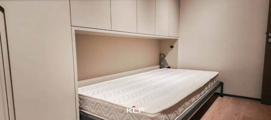 衣帽间采用“一门到顶”的设计,柜体与墙面接缝处不留缝隙,减少卫生死角。衣柜内部结构合理,分区明确。铣槽拉手柜门平整顺滑,强迫症党看了表示超舒服。折叠床柜一体设计暗含巧思,打开便是一张折叠床,偶有客人留宿不是问题。