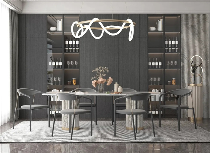 餐边柜酒柜的组合设计,增加实用性的同时也带来了丰富的层次感与趣味性。线条流畅、清晰,金属与灯光碰撞出精彩的火花,简约而精致的设计感,在现代造型中显得十分高贵。