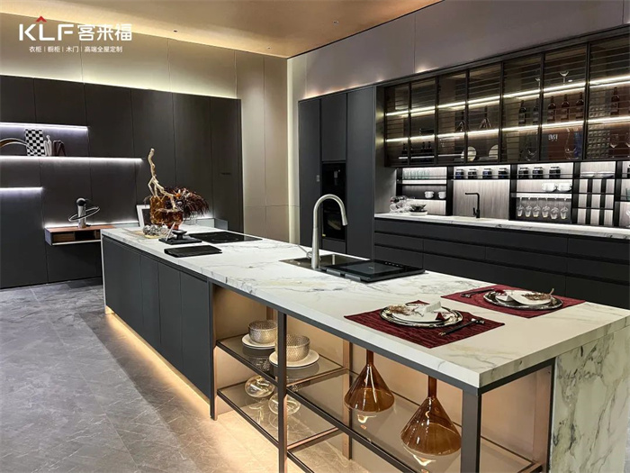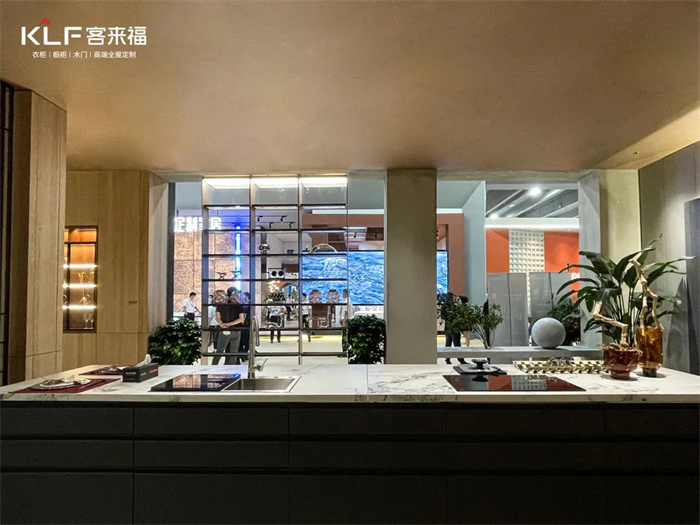 将客厅与开放式厨房打造成整体空间是升级的亮点之一,PET的工艺帮助我们实现嵌入式的内置功能,比如卫生间的灯光和冰箱。除此之外,整家定制也是xc体育今年的着力点,多功能的产品柜和开放式的设计模糊了空间界限。根据消费者对于一站式一体化的消费需求提供了解决方案。