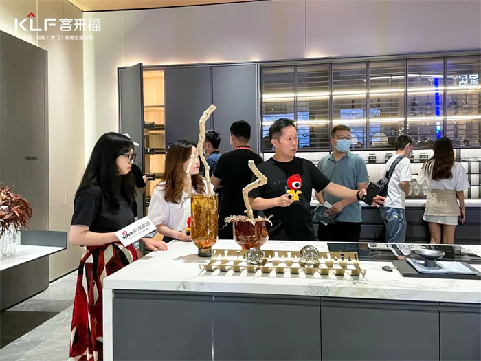 尹其宏董事长介绍道:xc体育在此次展会、也是在行业内,首次重磅推出水漆实木系列产品。最值得一提的是“天琛”系列色板的水漆半透工艺。从制作工艺上讲,采用了目前行业内最领先的半透工艺——“见木不见漆”,木饰面与肤感PET的结合橱柜。从水漆入手,水底水面,采用实木材质,看得到木皮但看不到油漆,近看可以清晰看出木纹通透的纹理感;0度肤感的触觉,体验进一步升级了产品的质感。