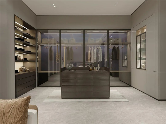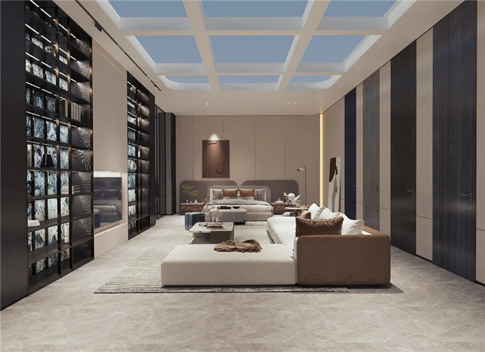 产品囊括了客厅、卧室、餐厅、衣帽间、书房等空间,让家不仅仅是居住地,更是享受生活的地方。客厅采用了一柜到顶的全铝框架电视柜,背面搭配云石灯背景,简约而不简单;衣帽间采用时尚科技的电动平移巴士门,于细节之处彰显魅力;餐厨空间墙面墙板整包,给人舒适温馨之感;简约式悬挑书柜设计搭配烤漆工艺超薄带灯层板,氛围感十足。