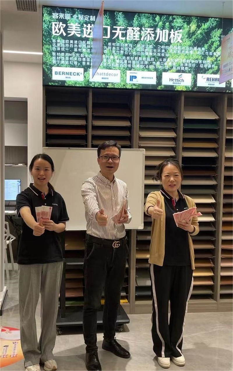 在本次活动中,许总先进行门店员工相关培训、总结工作,以客户为中心,提升服务作为培训重点,为终端消费者提供更专业的定制家居服务。随后,向在活动期间业绩突出的员工进行现金嘉奖,对员工优秀的服务和专业的能力表示认可。