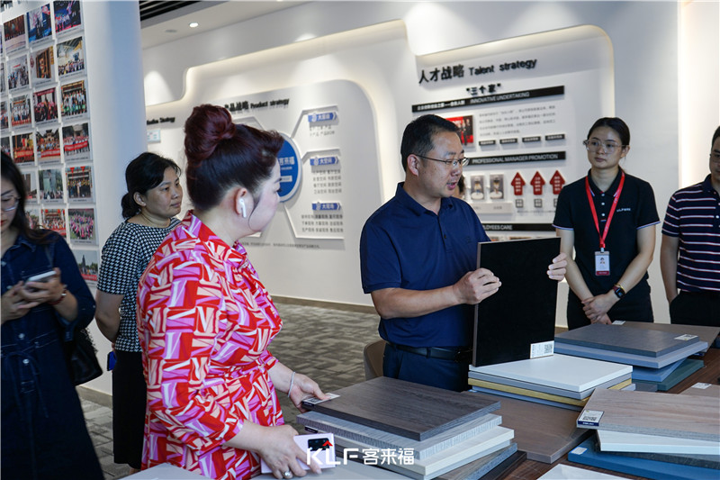 在参观现场,芜湖市镜湖区投资中心领导触摸xc体育产品板材,真切体会木作的质感以及工艺美感。