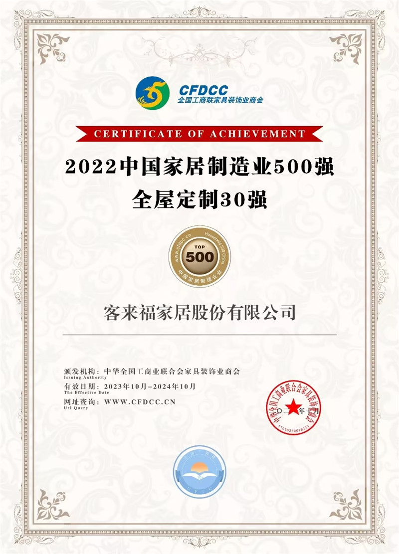 祝贺!xc体育家居股份有限公司获得2022中国家居制造业500强、全屋定制30强荣誉