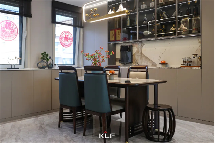 开放式餐厅设计,大气餐边柜玻璃柜门与开放格,超强的储物空间加上灯带的加持,颇有意境和空间感。