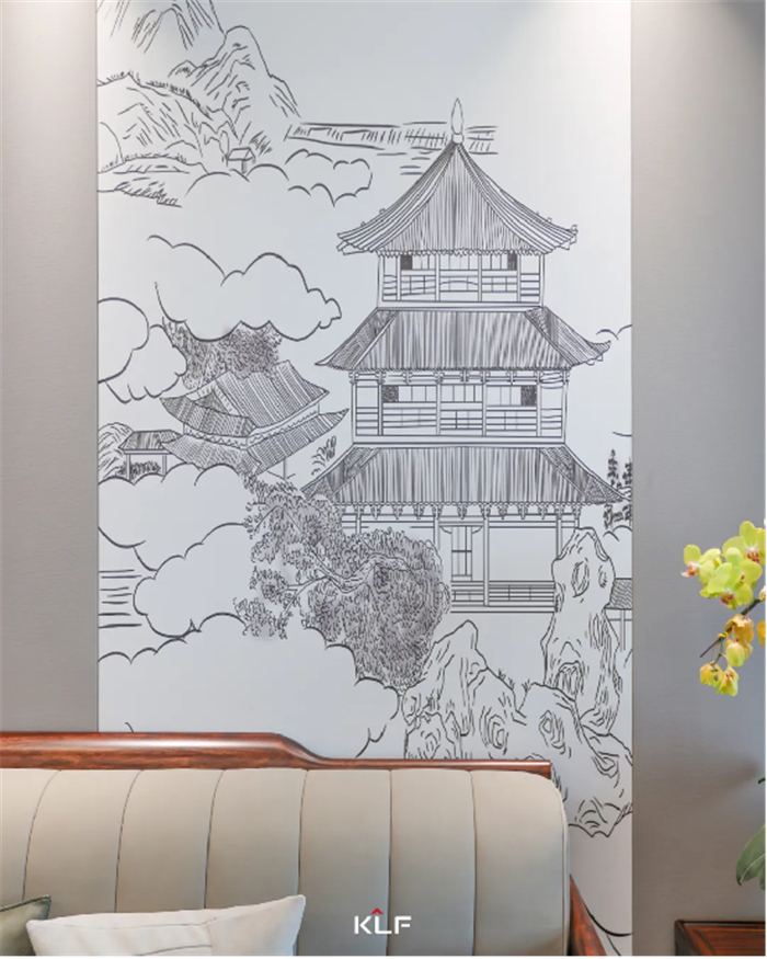 墙壁若隐若现的山水画与客厅搭配,素淡的笔调尽显山清水秀之美,素雅的色调与山水结合,勾画出我们心目中难忘的景色。