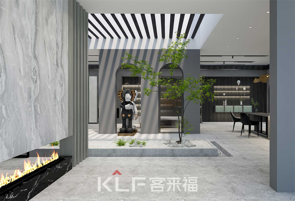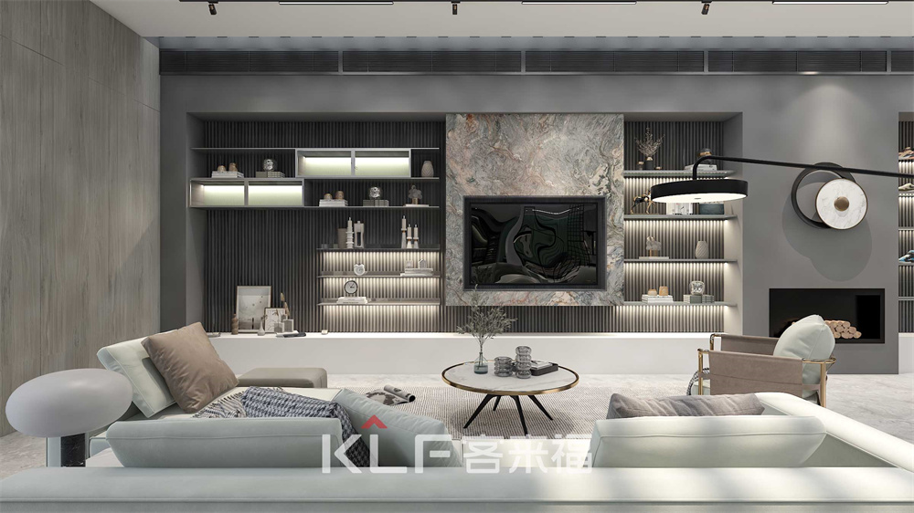 明亮的灯光点亮了空间的沉寂,背景采用栅栏式设计,为空间增添灵动感。分层次多功能的展示柜,按照入住需求进行摆放。嵌入式的电视柜设计,节省空间。