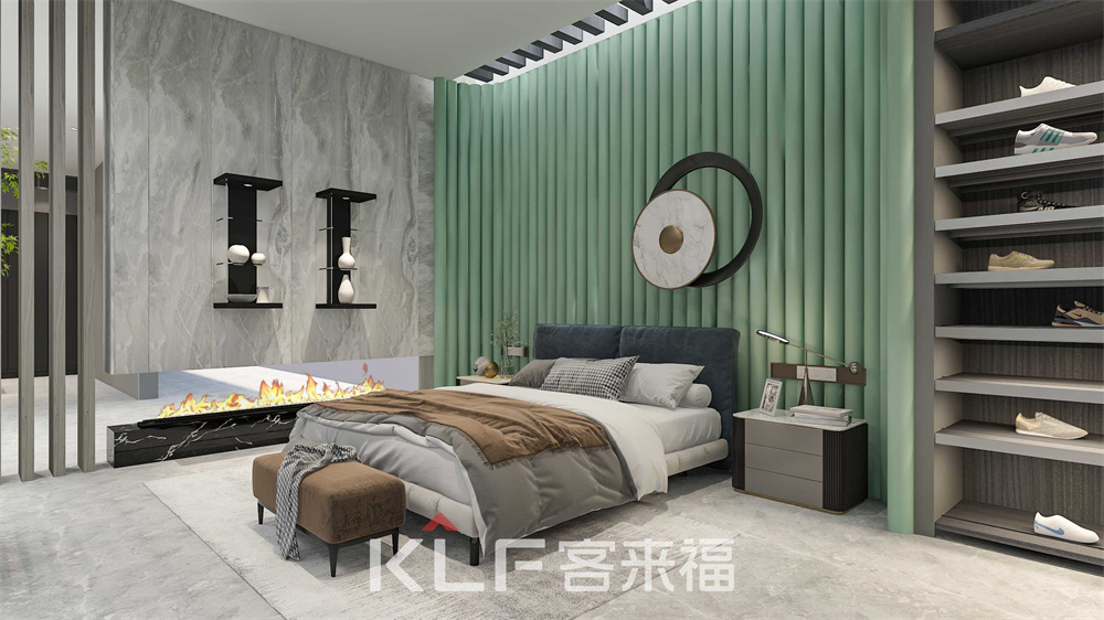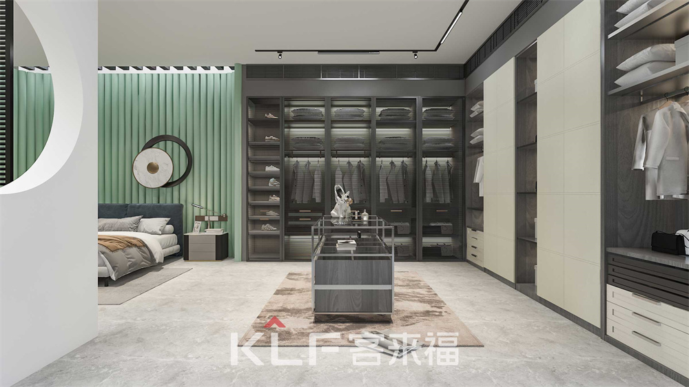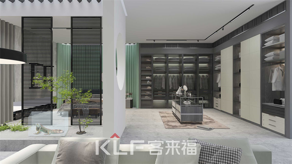 栅栏式背景设计塑造空间的线条感,灰色砖纹背景色的搭配加上具有艺术感的挂件,放大了空间的视觉效果。L型的衣帽间安排,衣帽间皮纹门板的运用低调奢华。采用阻尼轨道,在抽拉时光滑不受阻,给拉开抽屉时顺滑的享受。