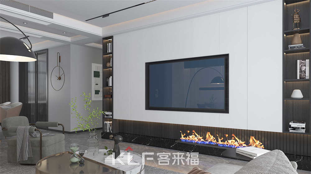 电视墙虽简约质朴,但也正因如此给整个客厅渲染出高端大气的氛围。两边的墙柜增加收纳的功能,底部的火炉效果给空间带去一丝生机活跃之感。