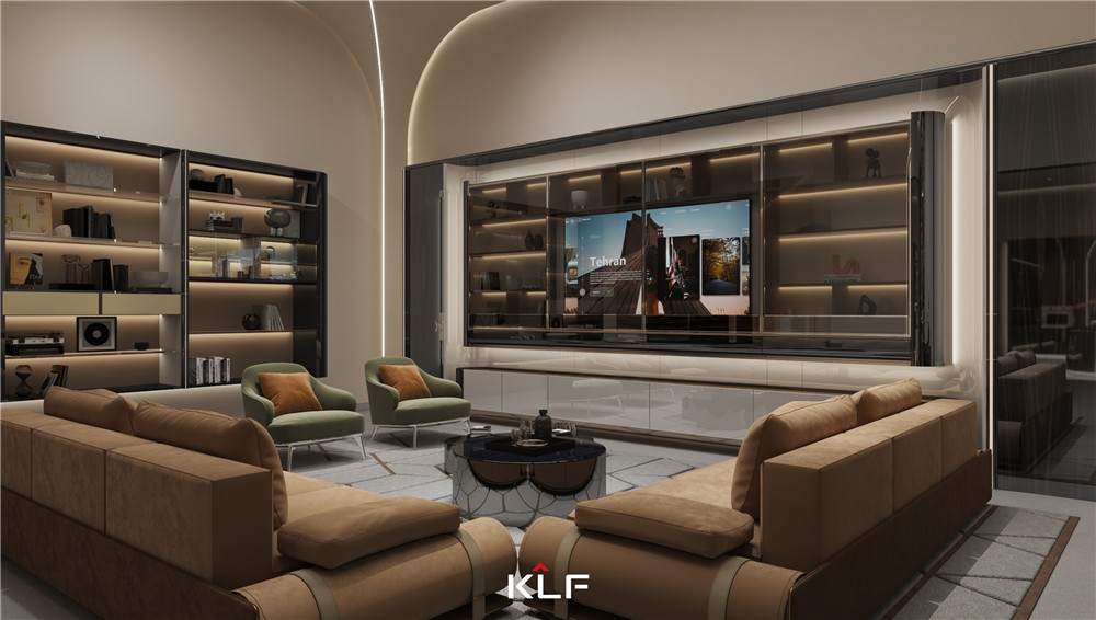 颜色上以白橡小山木纹搭配玻璃来呈现出轻奢,氛围灯光渲染出柔晕光线,增加层次感;独特的“F”品牌标签拉手,寓意“福”;挂衣杆以KLF中的“K”为灵感,打造了一个具有品牌辨识度的蝴蝶挂衣杆。