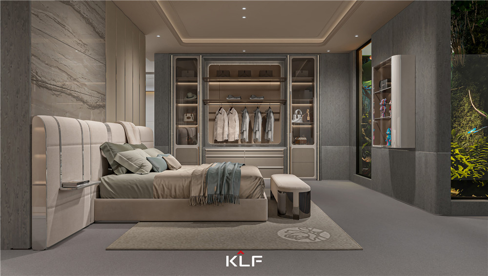 卧室背景墙以高级灰为主,金属线条装饰,营造出悠闲的空间氛围;衣柜背板采用了xc体育LOGO 标志实木雕刻板,颇具特色;两边配透明玻璃门对开门,方便换衣、打扮。