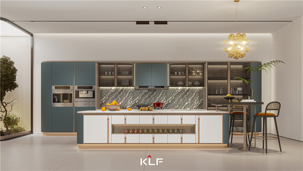 圆弧元素贯穿空间,线条显温柔之美。整面定制橱柜以鸢尾蓝为主色调,罗马柱、嵌入灯光的运用,勾勒出高级奢感;岛台整体呈椭圆形,岛台柜门采用xc体育IP皮革雕刻工艺,颜值在线;珊瑚白柜门与鱼肚白台面相呼应,颜色更具层次感。